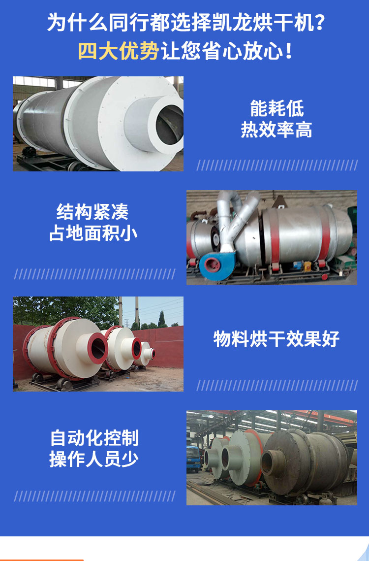 三筒式烘干機具有結構緊湊、構造簡單、布局合理,提高物料與熱能的熱交換率,使物料烘干效果好;基礎投入少,僅是相同產量單筒烘干機的二分之一,減少了一次性投入;運行可靠、能耗低、熱效率高;同時,容易實現自動化控制,減少操作人員,節約勞動力資源。